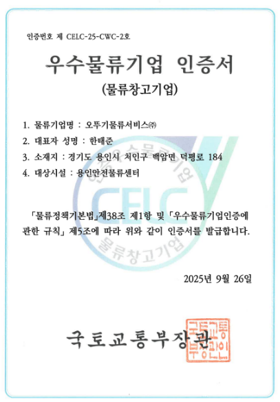 오뚜기물류서비스㈜는 서류심사와 현장심사를 통해 물류시설 운영 수준이 우수하여 국토교통부로부터 2025년 9월 우수물류기업임을 인증을 우수물류기업 인증은 경영체계와 서비스 품질을 종합적으로 평가하여 기업의 경쟁력과 신뢰도를 제고하고, 경영효율화 및 친환경/안전중심의 우수물류기업 인증 효과로는 정책자금 우선 지원, 공공입찰 가점 부여 등 법적혜택과 경영•운영 •재무 •물류관리 •친환경 등 전반적인 시스템을 또한 인증을 통해 직원들의 물류품질에 대한 인식이 강화되며, 대내외적으로 우리 회사의 발전과 혁신을 널리 알리는 계기가 되었습니다.